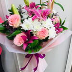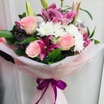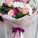 Limonium - 3 pcs white chrysanthemums - 4 pcs pink lilies - 4 pcs ruscus leaves - 5 pcs pink wrapping paper - 6 pcs pink roses - 5 pcs