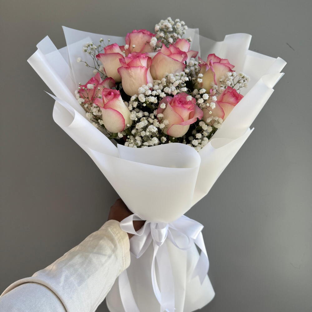 This Pink Roses Babys Breath bouquet is a super cute and gentle way to show you care. It features ten lovely pink roses mixed with fluffy white filler flowers, making it look soft, sweet, and perfect for brightening someones day. What Makes It Special (Key Features) Gentle Loving: Pink roses represent grace and happiness, so this is a great choice for saying thank you or I adore you. Cute Fluffy: The white Gypsophila (babys breath) adds a cloud-like texture that makes the pink roses look even prettier. Perfectly Petite: It’s a nice, compact size that fits anywhere easily: Width: 20 cm Height: 29 cm What’s Included (Item Composition) We put this lovely little arrangement together with: Pink Roses: 10 PCs Gypsophila (White Filler): 4 PCs Wrapping Sheets: 5 PCs Satin Ribbon: 1 PC Price Price: 99 AED This bouquet is a simple, beautiful, and thoughtful gift that feels straight from the heart!
