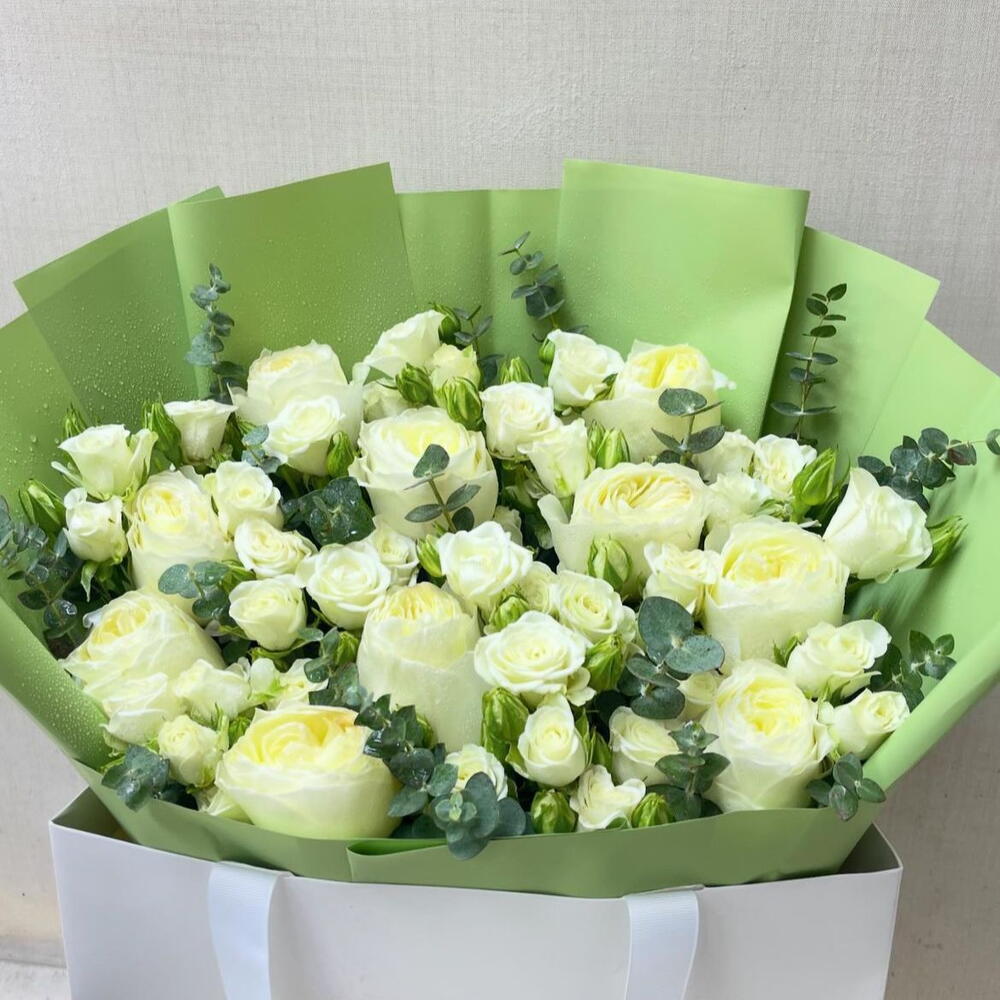 eucalyptus. - 5 pcs white baby rose - 9 pcs white big rose - 8 pcs