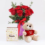 I Love You Teddy 25cm, Premium Sweecho Chocolates 250gm, 11 Red Roses, Leaves - 2 Palviforia, Arranged in a Glass Vase, Tied with Red Ribbon.
