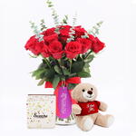 I Love You Teddy 25cm, Premium Sweecho Chocolates 250gm, 21 Red Roses, Leaves - 7 Eucalyptus, Tied with Red Ribbon, Arranged in Cylierical Galss Vase - 12x20cm.
