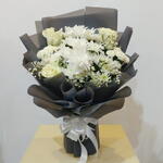 White rose - 3 pcs Gypsophila - 5 pcs Chrysanthemum white - 10 pcs chrysanthemum white button - 8 pcs