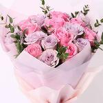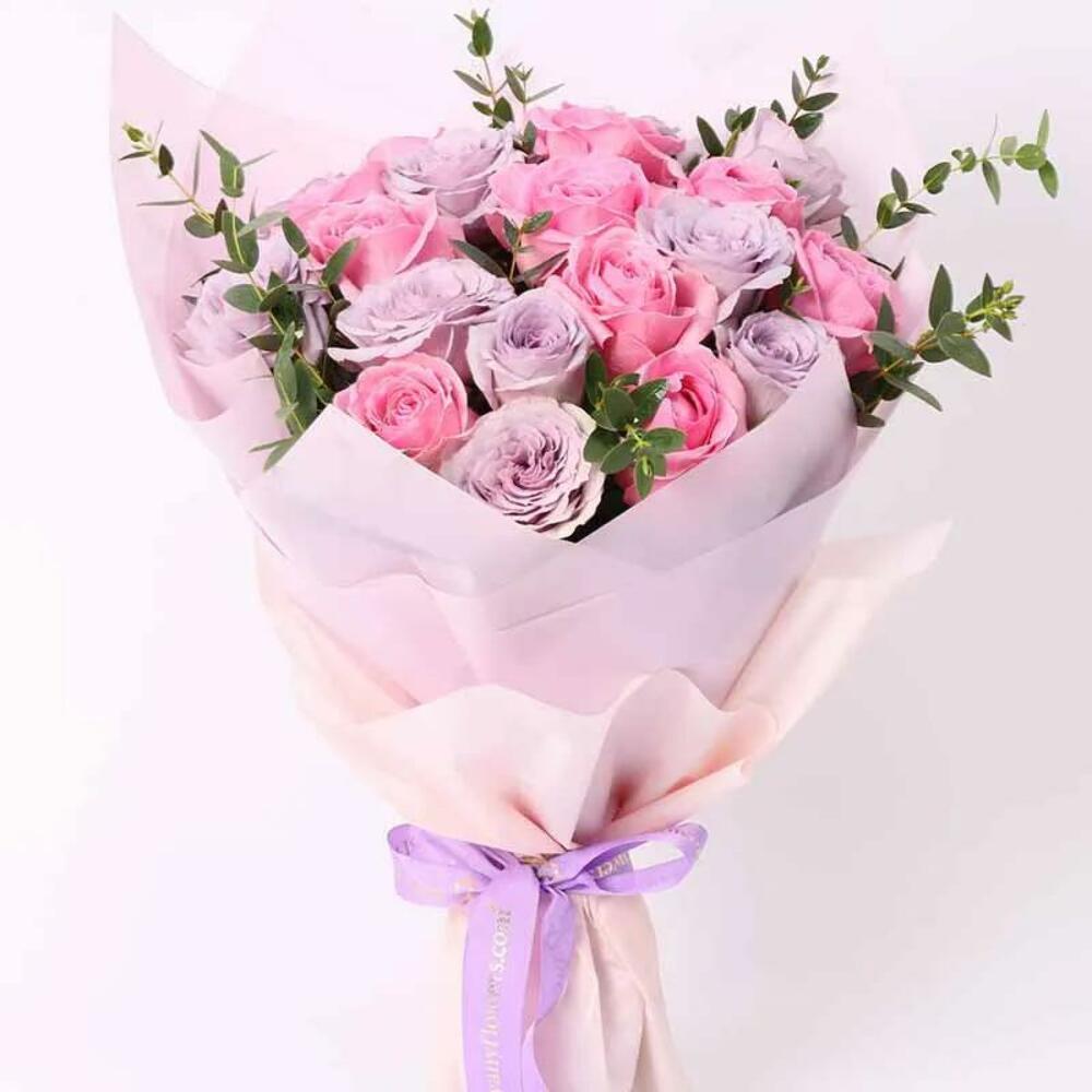 11 Pink Roses 10 Light Purple Roses Palviforia Leaves Beautifully Wrapped and a Ribbon Bow