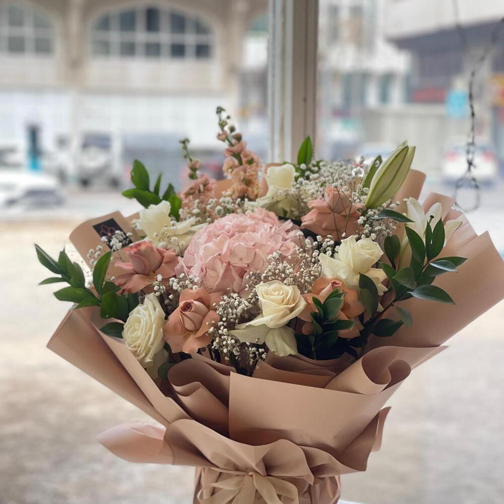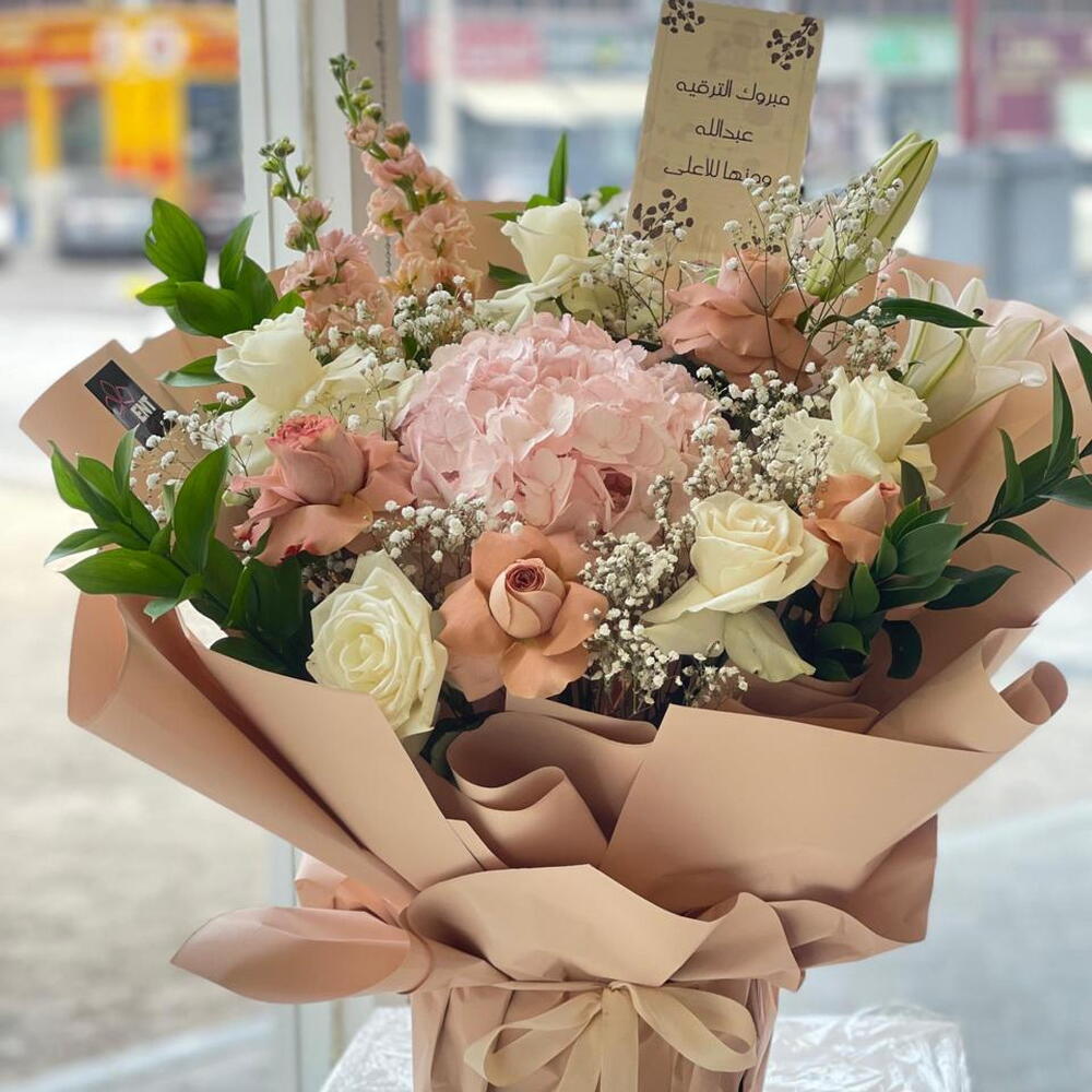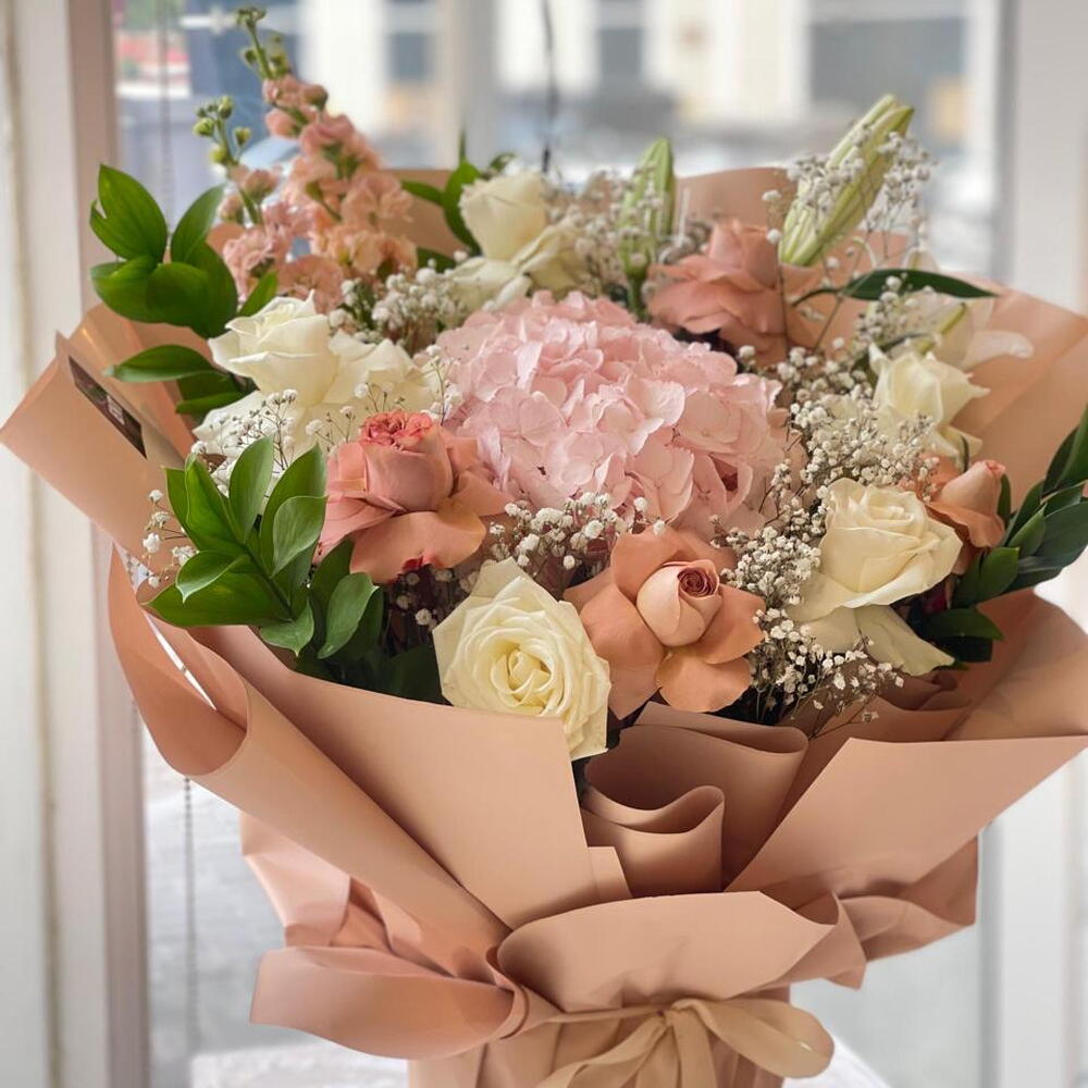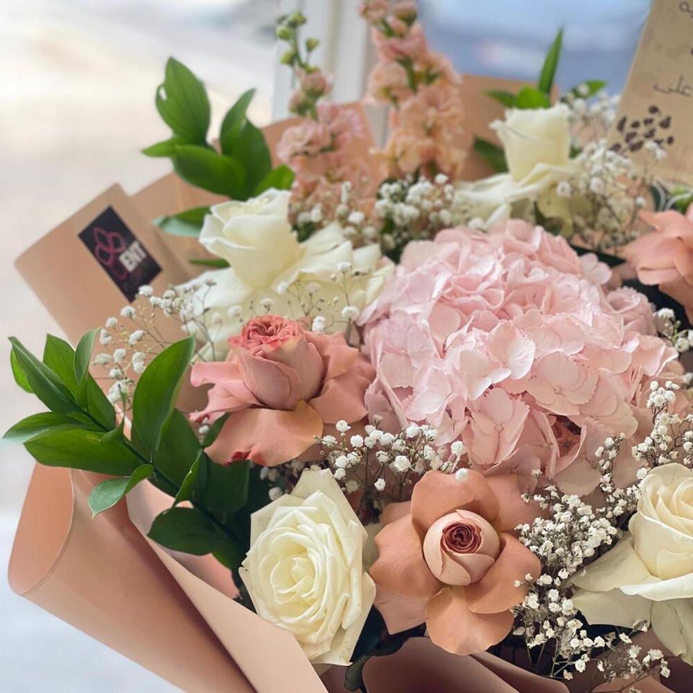 تدلل على قريبك أو حبيبك بهذه الباقة المميزة المصممة بعناية فائقة. تحتوي الباقة على مزيج من الروز البيج الفاتح والروز الأبيض الرائع وهي تتكون من 4 قطع من الروز البيج, و5 قطع من الروز الأبيض. بالإضافة إلى زهرة الليلي البيضاء الجميلة والهيدرينجا المبتسمة, كل واحدة منها نقطة واحدة فقط. ولكن الباقة لا تتوقف عند هذا الحد، فهي تحتوي أيضًا على 5 قطع من الرسكاس و4 قطع من الجبسوفيليا. هذه الباقة ستكون عنصراً مذهلاً لأي مناسبة وستحظى بإعجاب كل من يراها.