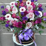 Box - 1 pcs Green leaves - 7 pcs pink Gerbera - 4 pcs purple lisianthus - 4 pcs purple tulips - 10 pcs purple roses - 10 pcs cybidium white - 5 pcs