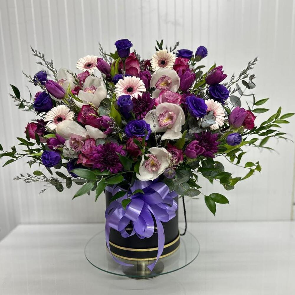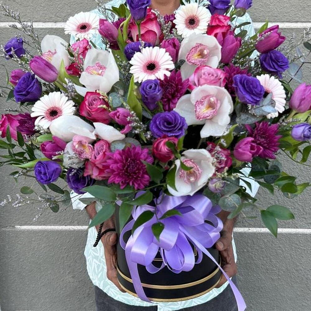 Box - 1 pcs Green leaves - 7 pcs pink Gerbera - 4 pcs purple lisianthus - 4 pcs purple tulips - 10 pcs purple roses - 10 pcs cybidium white - 5 pcs