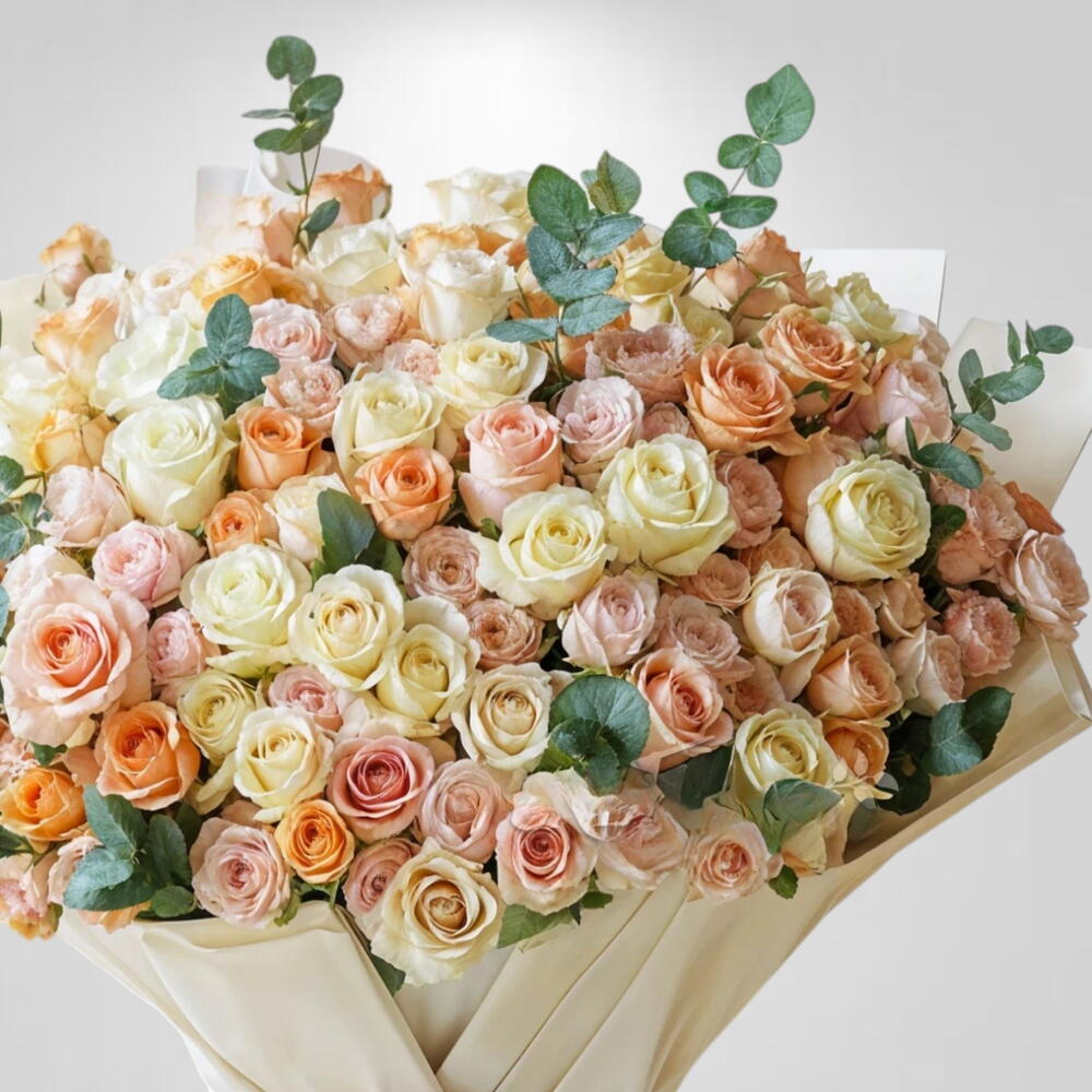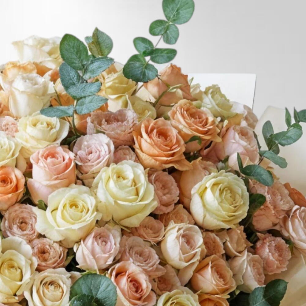 eucalyptus leaves - 10 pcs peach roses - 11 pcs soft pink roses - 50 pcs cream white roses - 40 pcs
