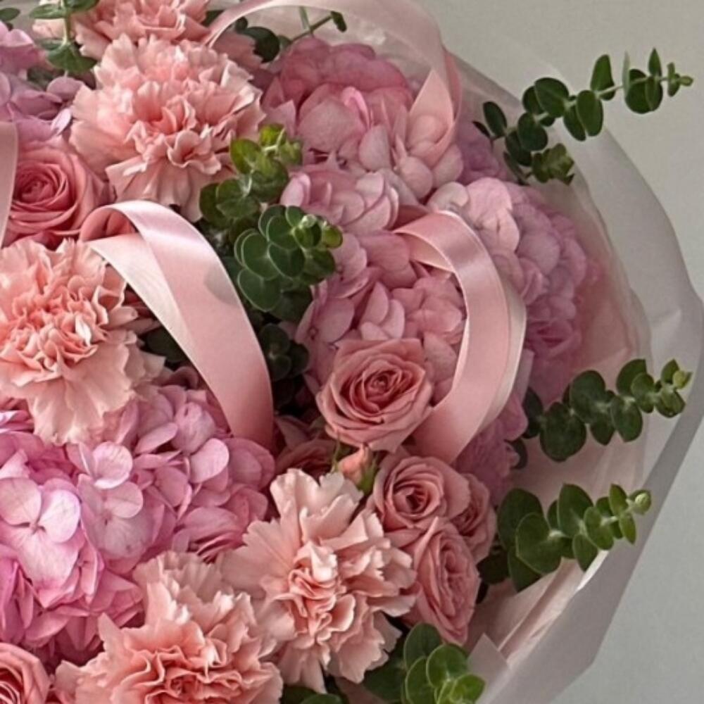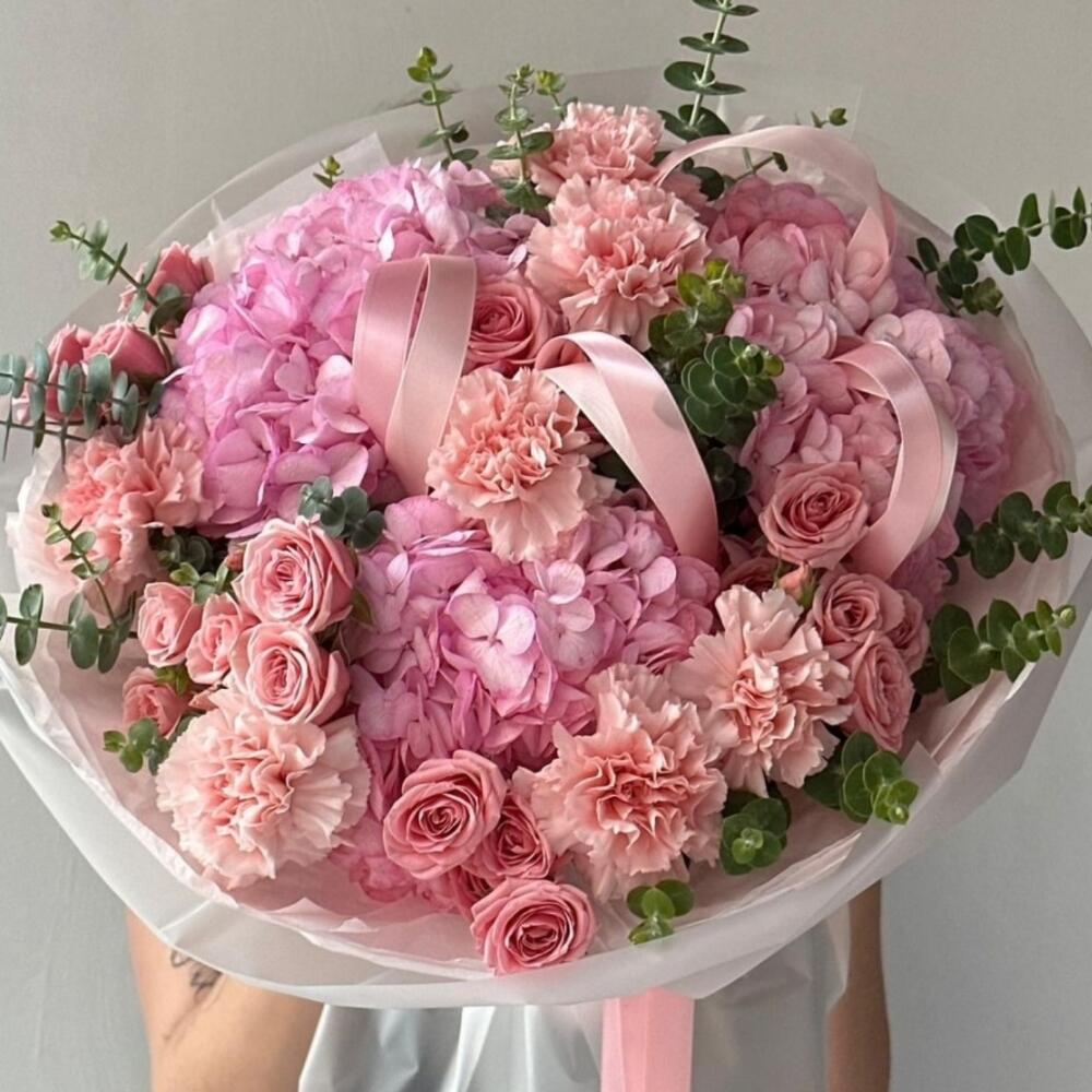 pink hydrangea - 5 pcs eucalyptus leaves - 15 pcs peach spray roses - 20 pcs peach pink carnations - 10 pcs