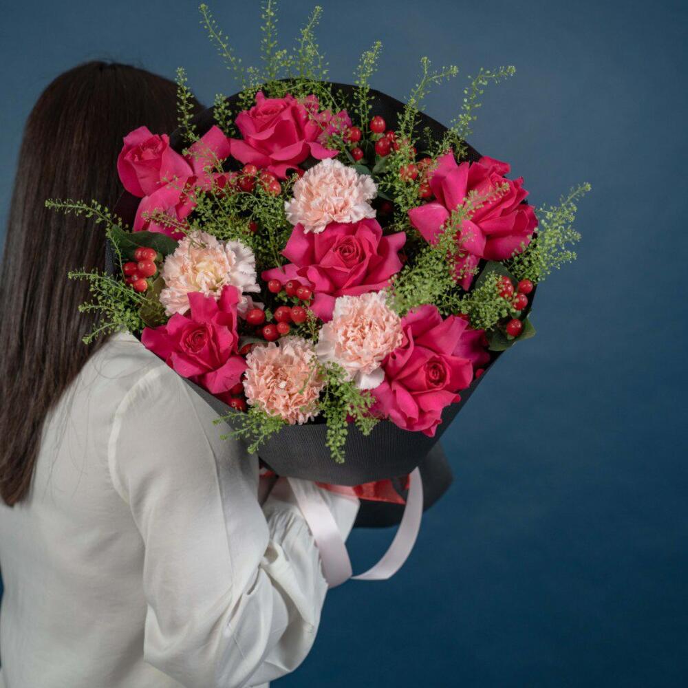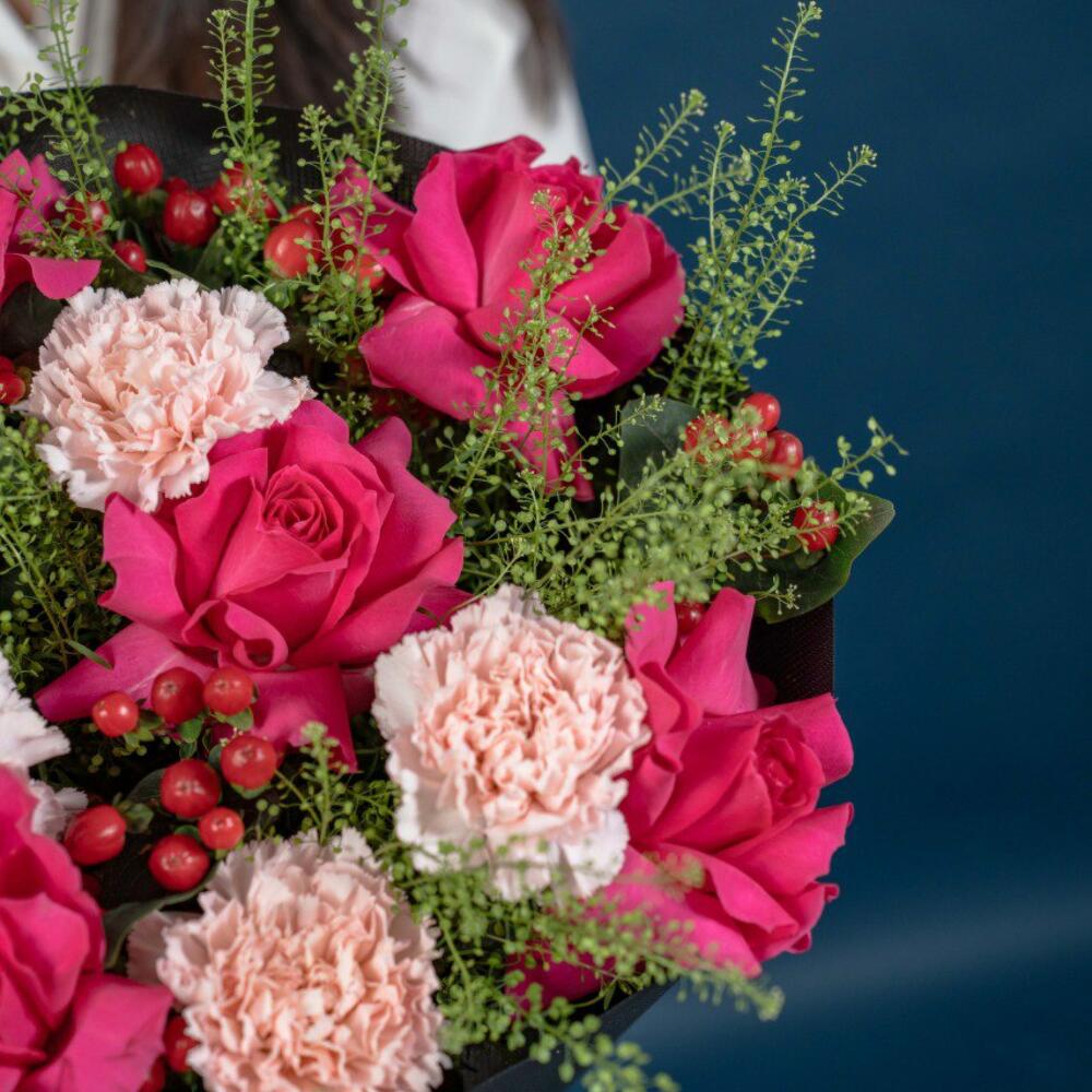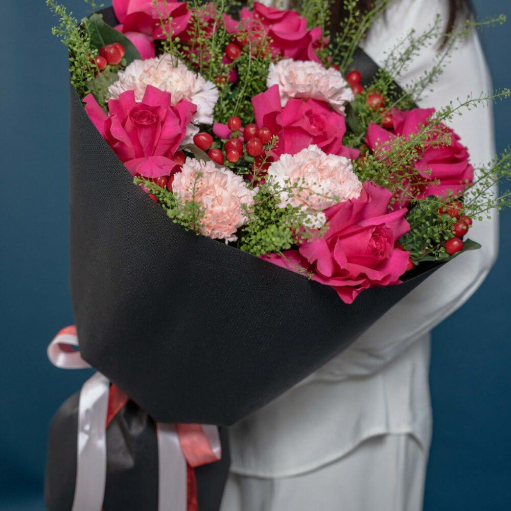 hypericum red - 6 pcs carnation light pink - 4 pcs thalaspi - 4 pcs rose fuschia floyds - 6 pcs