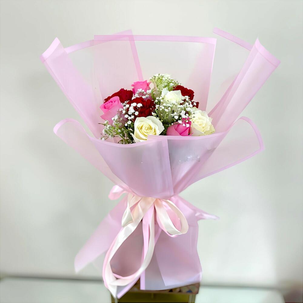 Red rose - 3 pcs Pink rose - 3 pcs White rose - 3 pcs Gypsophila - 1 pcs
