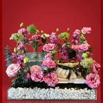 Eucalyptus - 3 pcs Lisianthus - 5 pcs delphinium - 5 pcs acrylic tray - 1 pcs ammi visnaga - 4 pcs betta fishbowl - 1 pcs