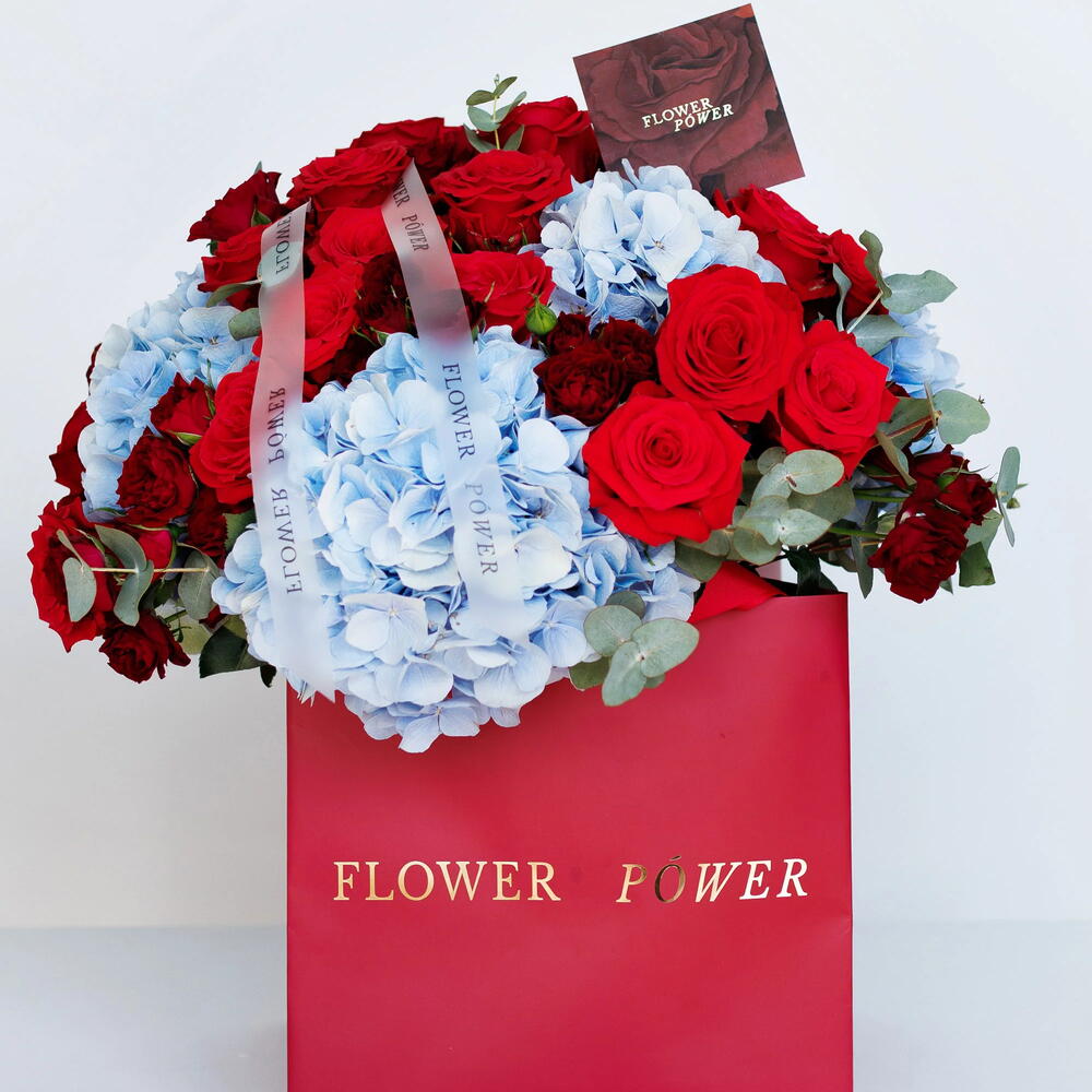 A sophisticated and enchanting bouquet, the Bewitching Brightness features a rich palette of colors in an exquisite round arrangement. This stunning floral masterpiece is an unforgettable celebration gift or a precious accessory perfect for making any special occasion truly magical. Medium Size - 6 Blue Hydrangeas, 25 Rose, 10 Spray Roses