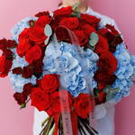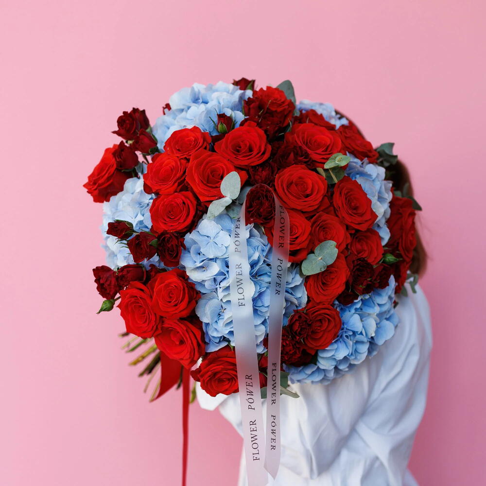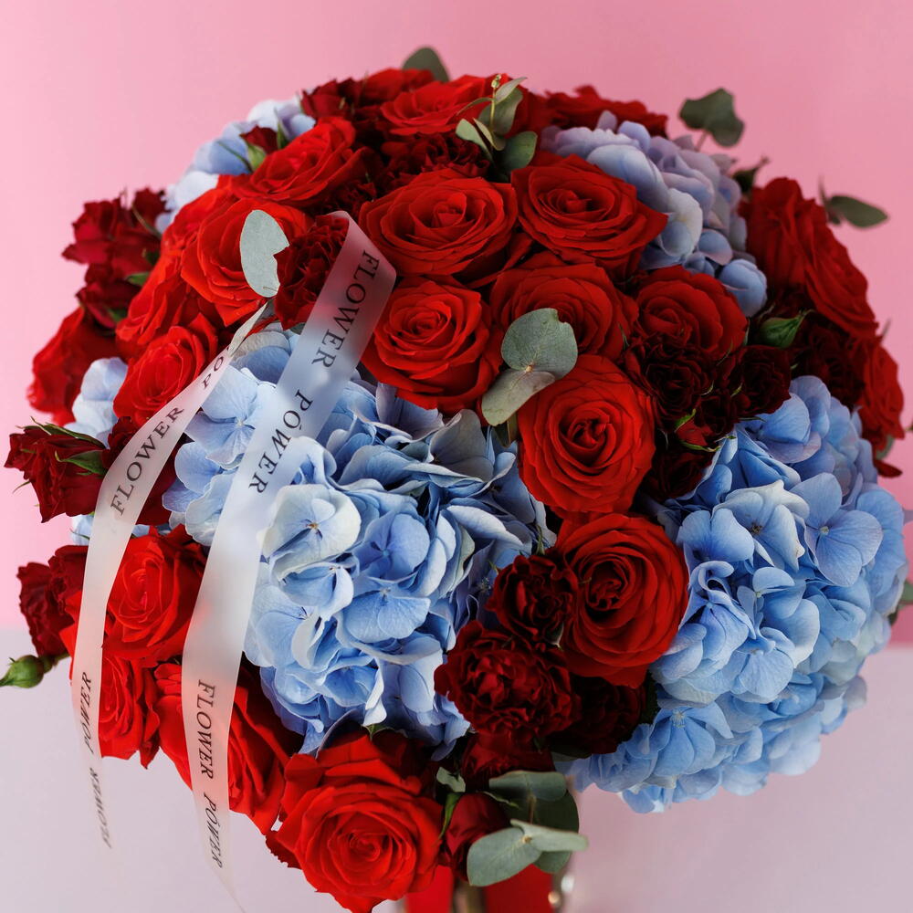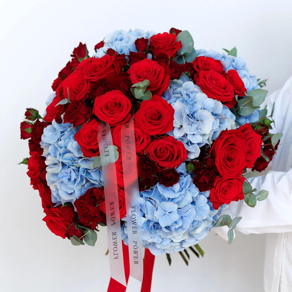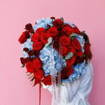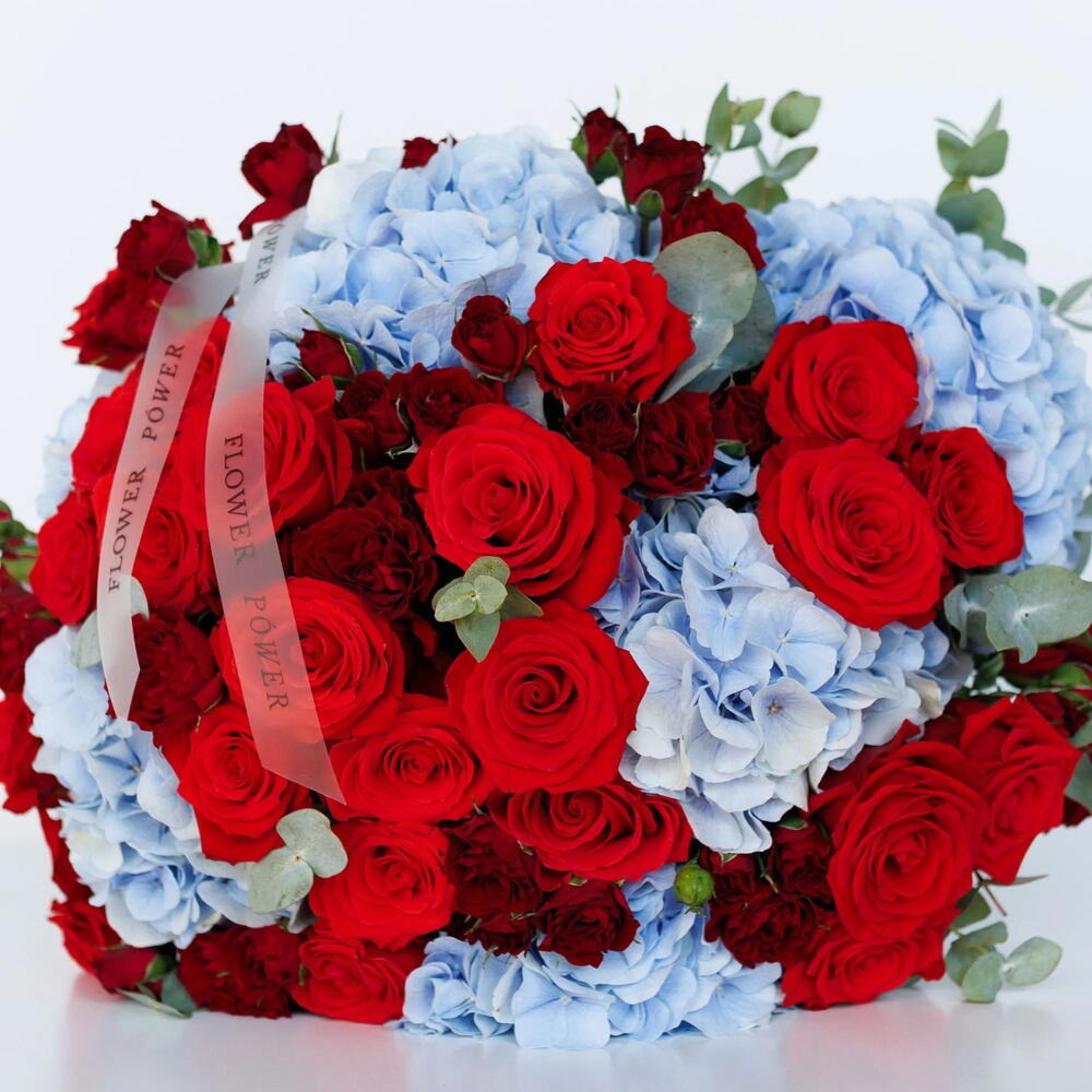 Bewitching: Bouquet of Blue Hydrangeas, Red Roses and Garden Spray Roses