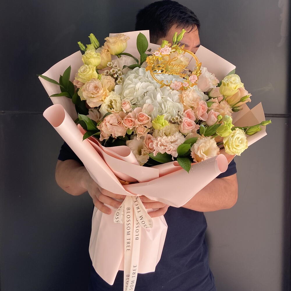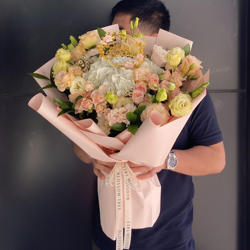 Introduce a breath of fresh elegance to your celebrations with this beautiful concoction from our Florists Specials. The bouquet is meticulously designed, weaving together 3 exquisite spray roses, 8 enchanting lisianthus, 3 delicate wax flowers, and 1 radiant white hydrangea. Topping off the graceful assembly is a birthday acrylic topper, adding a fitting flourish to the floral ensemble. This arrangement, in its varied vibrant blooms, promises to be a gift that speaks volumes of your heartfelt wishes.