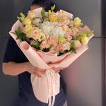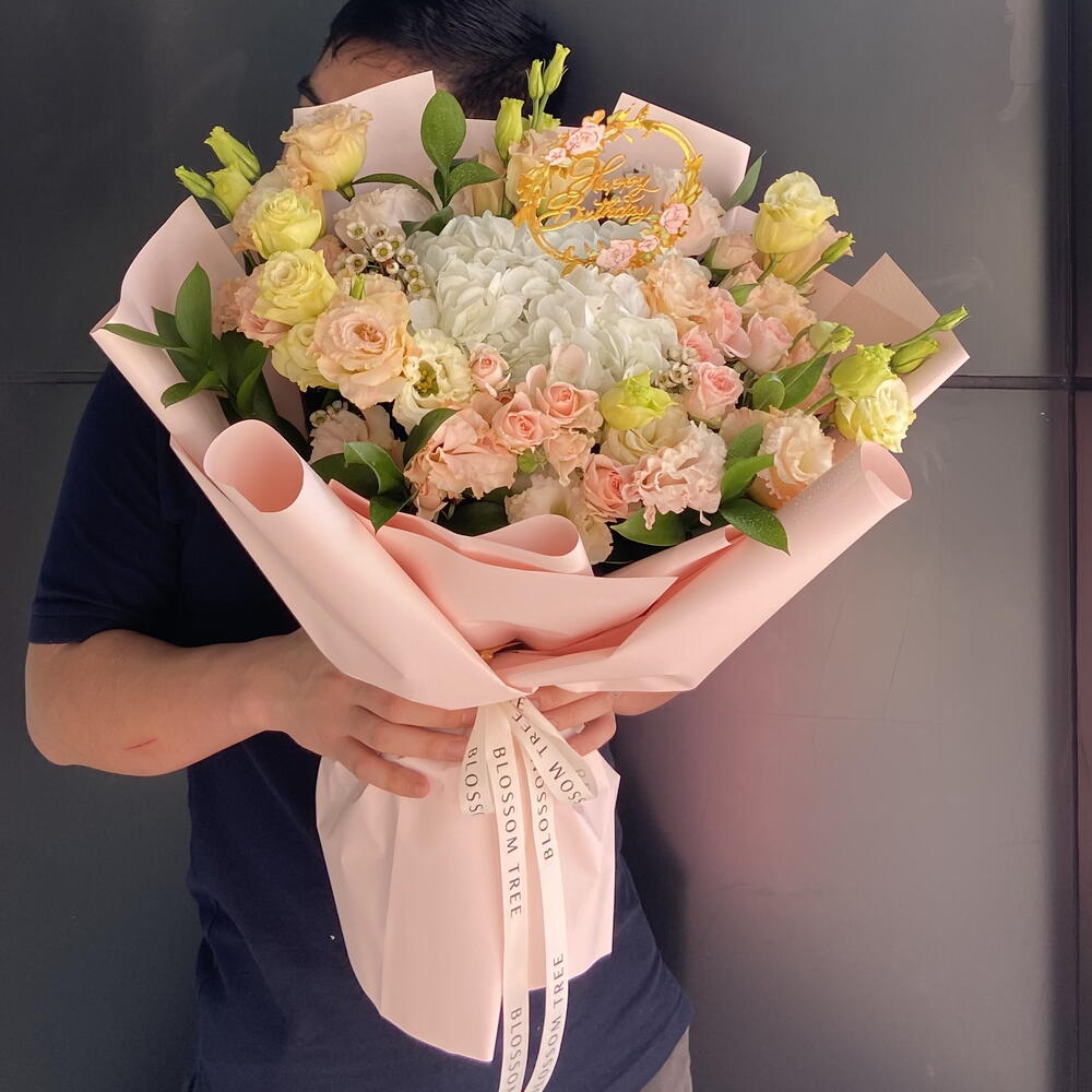 Ruscus - 5 pcs Spray rose - 3 pcs Lisianthus - 8 pcs Wax flower - 3 pcs hydrangea white - 1 pcs birthday acrylic topper - 1 pcs