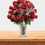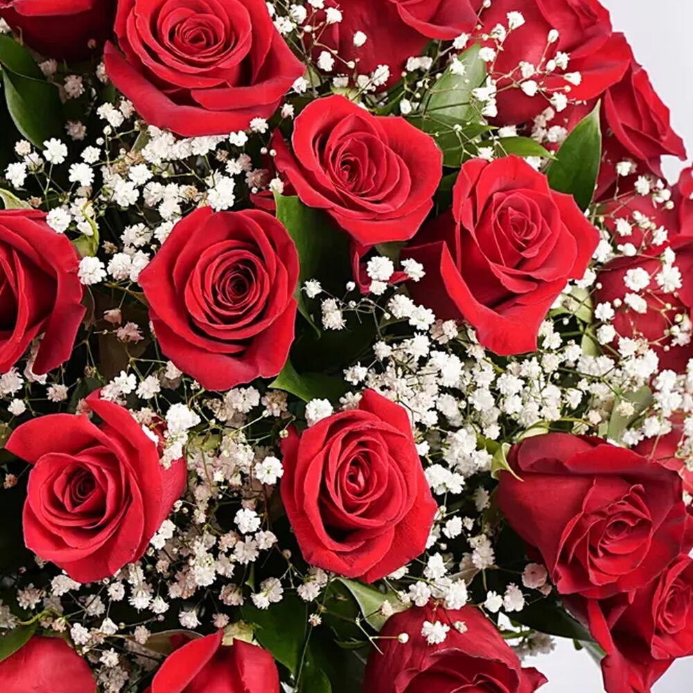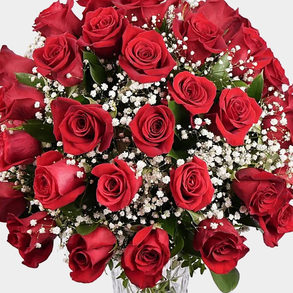 A grand arrangement of the fifty roses with white gypso, pistachios and green discus styled in a conical glass vase. A bold and elegant declaration of deep love.