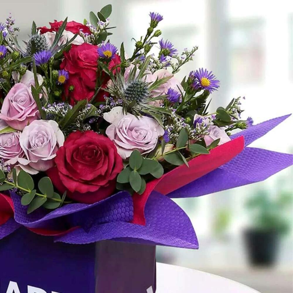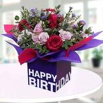 Product Details: 5 Stems Dark Pink Roses. 4 Stems Eryngium Flower. 4 Stems Purple Roses. 2 Stems Purple Spray Roses. 2 Stems Aster Blue Flower. 2 Stems Green Ruscus Leaves. 1 Stem Eucalyptus Parvifolia Leaf. 1 Stem Limonium Leaf. Beautifully Handcrafted On A 12X12 Cm Square Glass Vase. Happy Birthday Sticker On Glass Vase In Both Arabic And English Language.