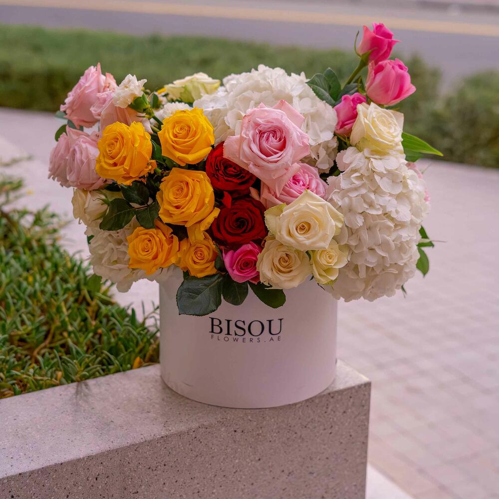 Box Arrangement of 30 stems of mix roses of white red pink yellow and 4 stems of white hydrangea in a box