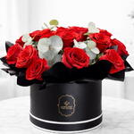 Eucalyptus - 7 pcs black box - 1 pcs red roses - 15 pcs