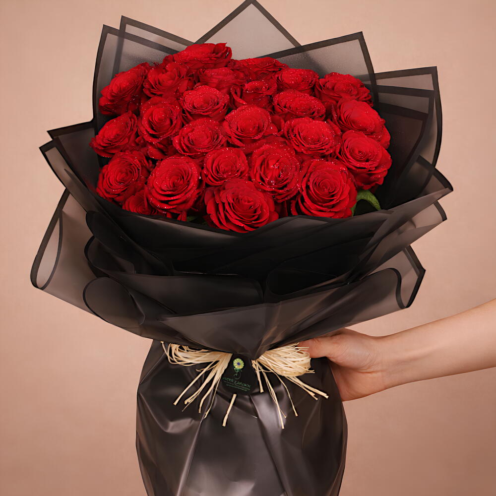 Evoke elegance and passion with our Black Pearl bouquet featuring 24 vibrant red roses. Each rose embodies timeless beauty, complemented by the deep allure of black pearl accents. Perfect for expressing love, admiration, or celebration, this arrangement exudes sophistication and charm. Make a statement that lasts with this exquisite floral masterpiece.