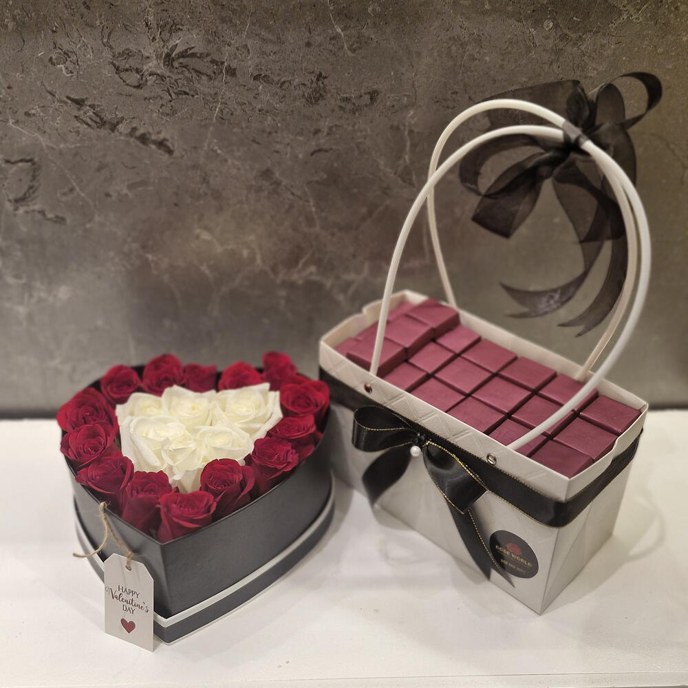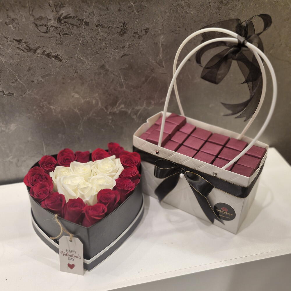 Red rose - 10 pcs White rose - 5 pcs chocolates - 20 pcs
