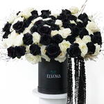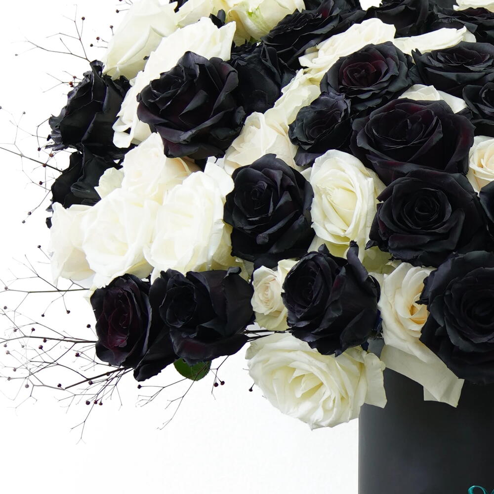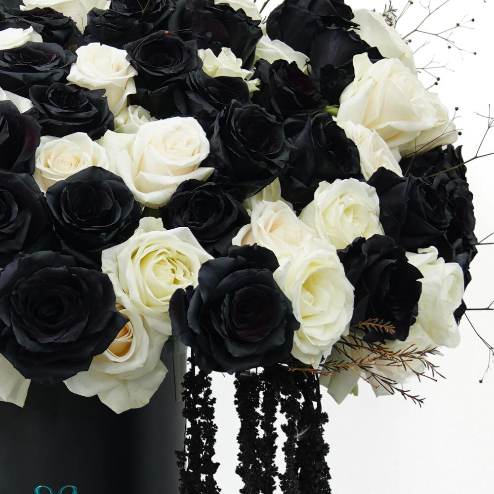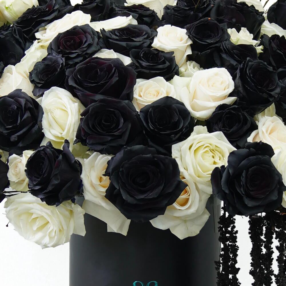 Eclipse Bloom is a moment where contrast becomes harmony. Deep black roses meet soft white blooms in a composition that feels intentional, bold, and quietly dramatic. The flowers stand side by side without overpowering one another, creating balance through difference rather than similarity.