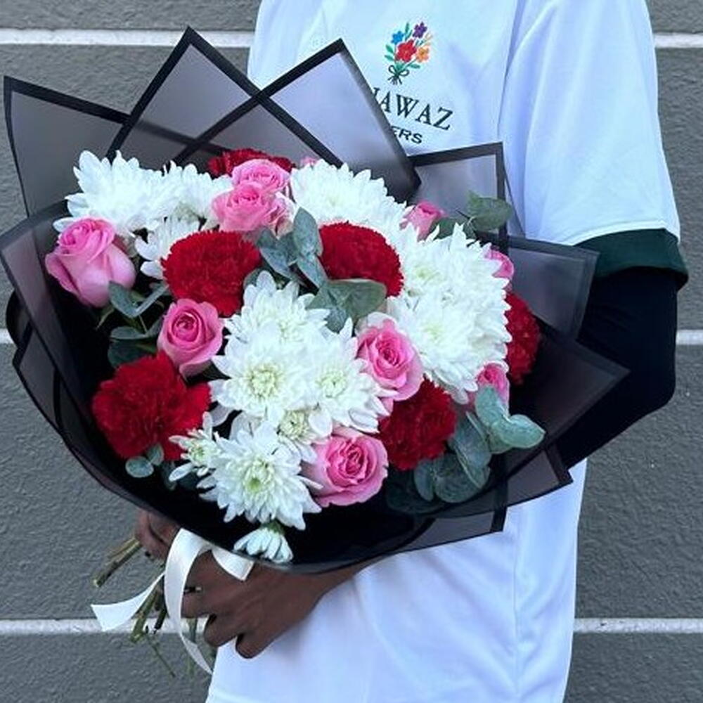 This enchanting Florists Special arrangement is a blend of 5 captivating red carnations, 10 charming revival pink roses, and 4 delightful pink chrysanthemums. Complemented by 3 refreshing eucalyptus leaves and wrapped in 4 pieces of high-quality paper, this bouquet captures an incredible harmony of colors and textures. As vibrant as it is fragrant, it will be a beautiful statement piece for any occasion.