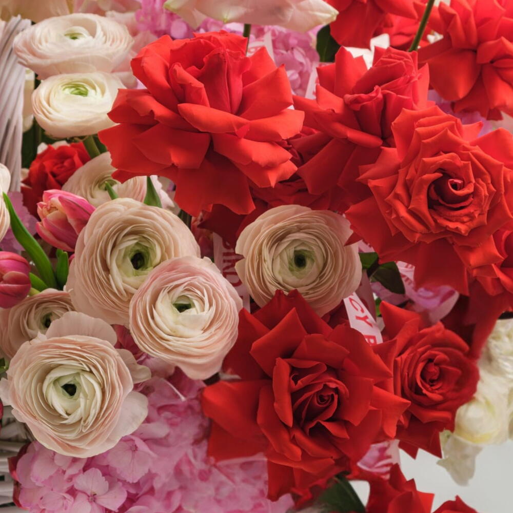 Red rose - 30 pcs Tulips - 20 pcs peach rose - 10 pcs white hydrangea - 5 pcs pink hydrangea - 10 pcs rununculus - 10 pcs