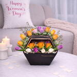 Des - Arrangement of 10 Orange Roses, 13 Tulips Pastel color in a Black Designer Box decorated with Pink Wax.