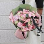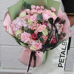 Charm your senses with our exquisite Florists Special arrangement. This delicate bouquet is expertly crafted with six fragrant pink carnations, two plush pink hydrangeas, and an elegant cluster of six deep purple roses. Also included are fifteen mixed pink spray roses, adding a dreamy blush tone to the ensemble, and six pure white roses, symbolizing the purity of your heartfelt emotions. To further enhance this symphony of colors, we include five wax purples and a touch of eucalyptus leaves, bringing a soothing aroma to the mix. The bouquet is carefully wrapped in blush pink with an olive green shade, and a pink and black ribbon is tied for a final elegant finish. This enchanting arrangement is sure to leave an unforgettable impression.