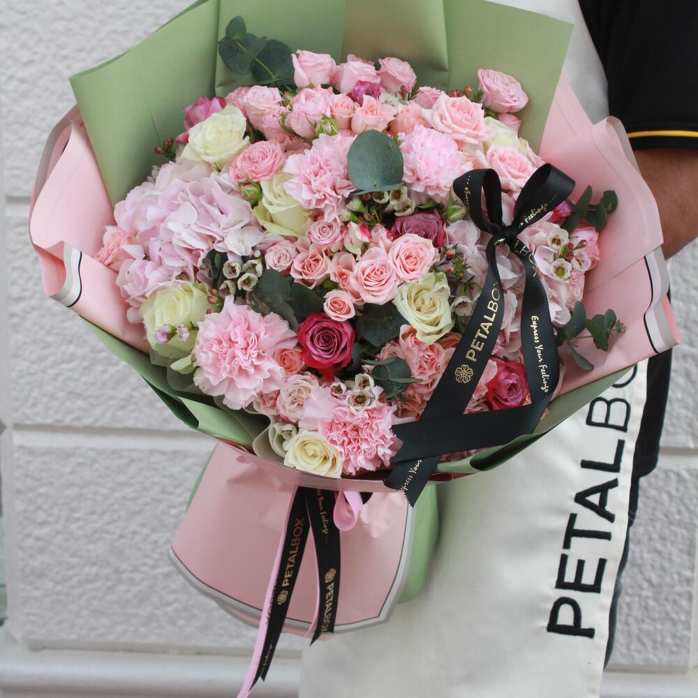 Charm your senses with our exquisite Florists Special arrangement. This delicate bouquet is expertly crafted with six fragrant pink carnations, two plush pink hydrangeas, and an elegant cluster of six deep purple roses. Also included are fifteen mixed pink spray roses, adding a dreamy blush tone to the ensemble, and six pure white roses, symbolizing the purity of your heartfelt emotions. To further enhance this symphony of colors, we include five wax purples and a touch of eucalyptus leaves, bringing a soothing aroma to the mix. The bouquet is carefully wrapped in blush pink with an olive green shade, and a pink and black ribbon is tied for a final elegant finish. This enchanting arrangement is sure to leave an unforgettable impression.