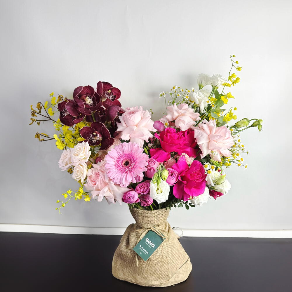 lisianthus white - 3 pcs spray rose white - 3 pcs gerbera pink - 1 pcs ohara pink - 5 pcs oncidium - 5 pcs cymbidium red - 1 pcs julieta rose - 3 pcs anigozanthos kangaroo paw yellow - 4 pcs madam cerio rose - 5 pcs camomile flower - 5 pcs
