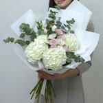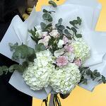 pink spray rose - 2 pcs pink carnation - 3 pcs white hydrangea - 3 pcs white lisanthus - 1 pcs
