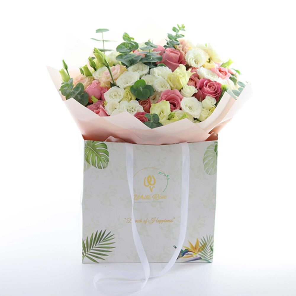 A bouquet with Roses , Baby Roses, Lisianthus and other mix of flowers arranged in a Bag.