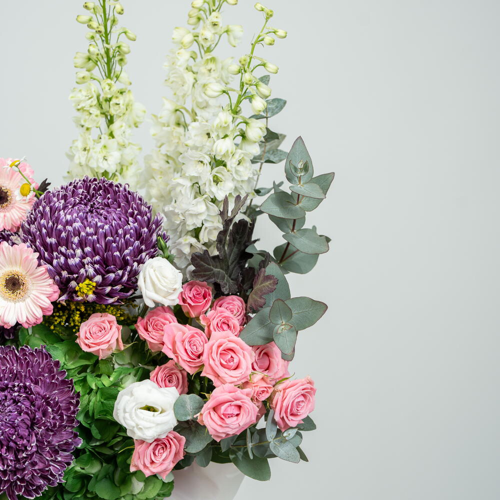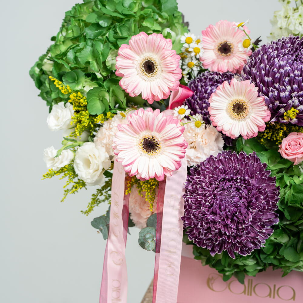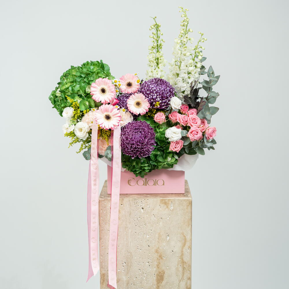 Experience the luxury with this stunning collection of floral delight housed within an elegant box. The enchanting arrangement comprises of two hydrangeas, presenting an alluring charm, accompanied by the golden glow of three solidago. The scene is further brightened by four vibrant gerberas, two pristine white eustomas, and a delicate tanacetum. The sweet essence of three spray roses in a soothing pink tone, three white delphiniums, and three light pink carnations adds softness to the ensemble. To complete the captivating mix, we have the royal touch with three purple chrysanthemum peonies. This blossom box is not only a sight to behold but a garden of pleasure to own.
