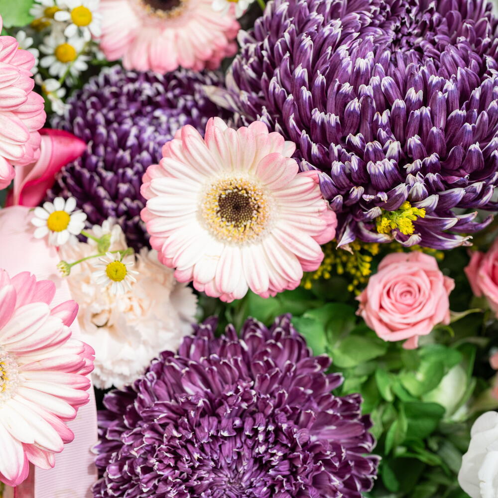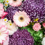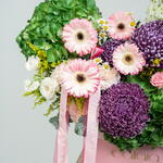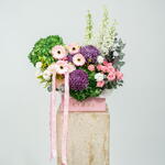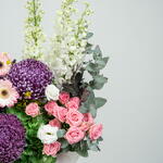 Hydrangea - 2 pcs Box - 1 pcs Solidago - 3 pcs Gerbera - 4 pcs Eustoma white - 2 pcs tanacetum - 1 pcs spray rose pink - 3 pcs delphinium white - 3 pcs carnation light pink - 3 pcs chrysanthemum peonies purple - 3 pcs