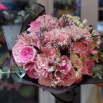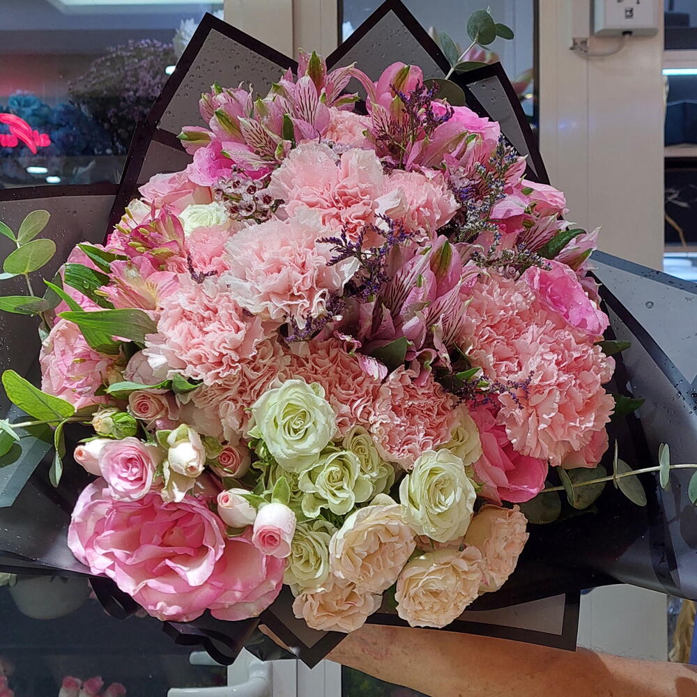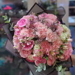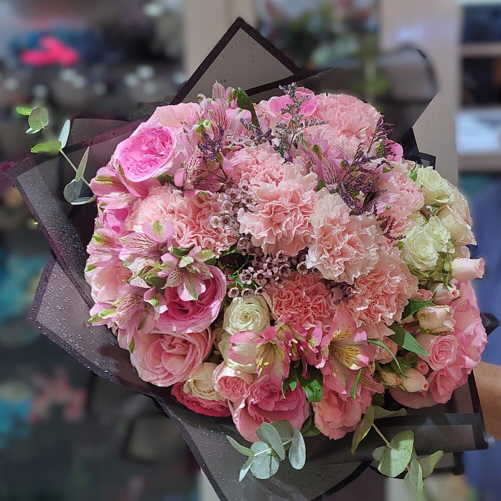 pink carnations - 6 pcs pink alstroemeria - 5 pcs lemonium - 1 pcs wox - 2 pcs pink roses - 11 pcs pink baby roses - 3 pcs white baby roses - 2 pcs leaves eucalyptus - 4 pcs