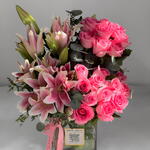 Grace meets softness in this stunning one-sided arrangement of 21 blush-pink roses paired with 3 delicate pink lilies, beautifully complemented by fresh seasonal greens. Designed in a sleek cube vase, this piece blends romantic charm with modern elegance, creating a bouquet that feels tender, expressive, and effortlessly luxurious. Every bloom is hand-selected for its gentle color and natural beauty, making this arrangement perfect for celebrating love, showing appreciation, or sending a quiet, heartfelt message. Its unique structure and soft palette make it ideal for birthdays, anniversaries, thank-you moments, or simply brightening someone’s day with something truly special. A bouquet that speaks gently… yet touches deeply. Send a touch of romance and grace — order the Pink Roses Lilies Cube Vase today for fast, premium delivery across Dubai.
