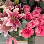 Ribbon - 1 pcs Eucalyptus - 4 pcs pink lilies - 3 pcs revival pink rose - 21 pcs squire vase - 1 pcs