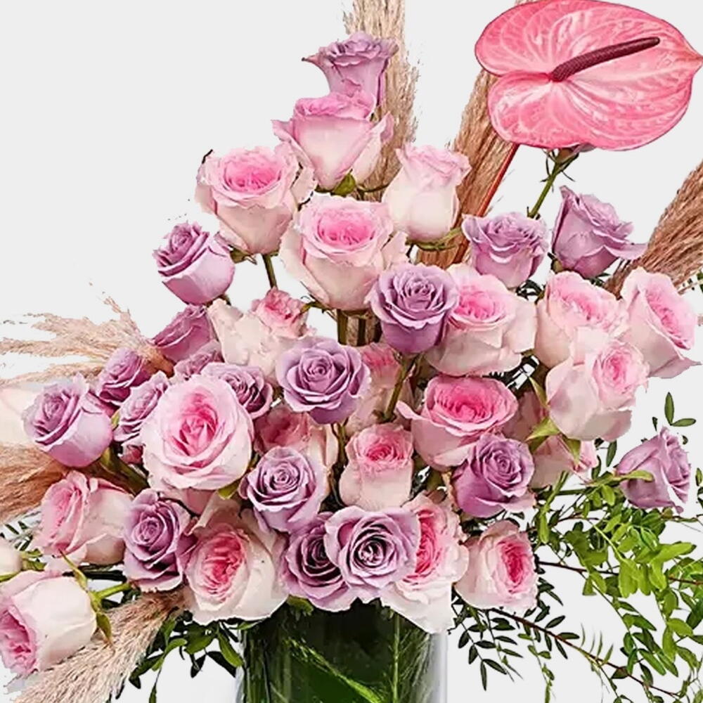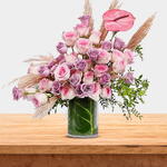 A luxurious blend of pink anthurium, pampas grass, pastel roses, eucalyptus and pothos. Artfully presented in a clear glass vase. A cylinder vase. A floral statement of elegance and delicate balance.