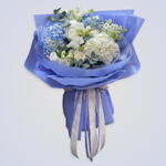White rose - 3 pcs mathiola - 3 pcs blue hydrangea - 1 pcs white hydrangea - 1 pcs stem lisianthus - 2 pcs
