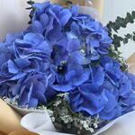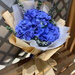 Beautiful blue hydrangea with brown wrapping and blue helium balloon