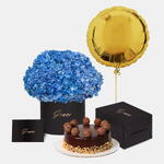 Delight your loved ones with our Blue Hydrangea in Box with Cake Bundle, combining elegant blooms and a delicious cake for a truly memorable gift experience.
