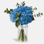 Brighten any space with this elegant arrangement of lush blue hydrangeas beautifully complemented by fresh eucalyptus. Presented in a stylish vase, it exudes sophistication and tranquility, making it perfect for gifting, home décor, or special occasions. A timeless floral display that adds charm and serenity to any environment.