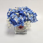 Gypsophila - 2 pcs blue hydrangea - 1 pcs small square glass vase - 1 pcs