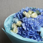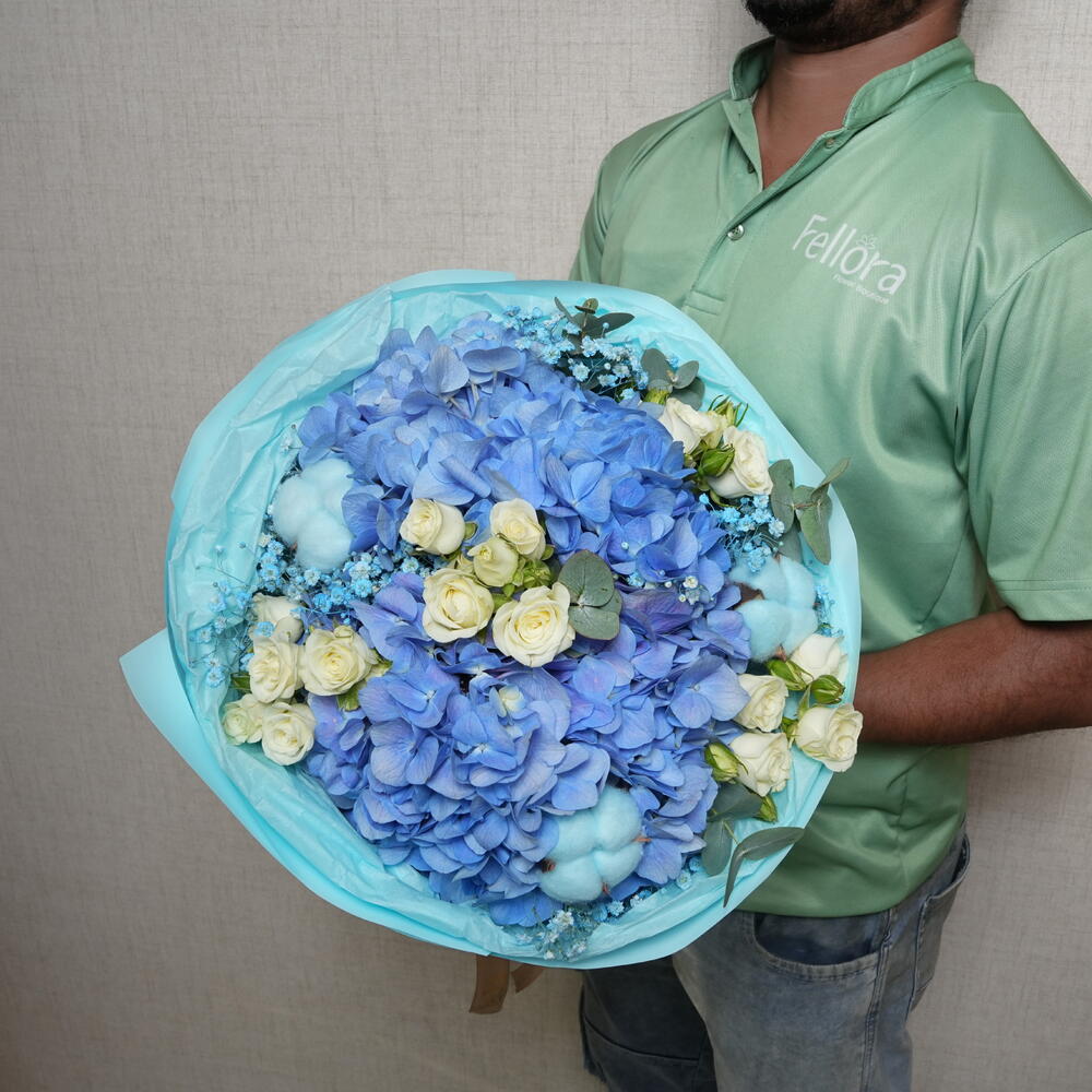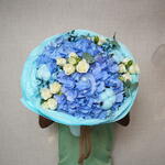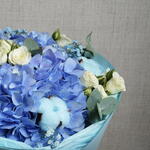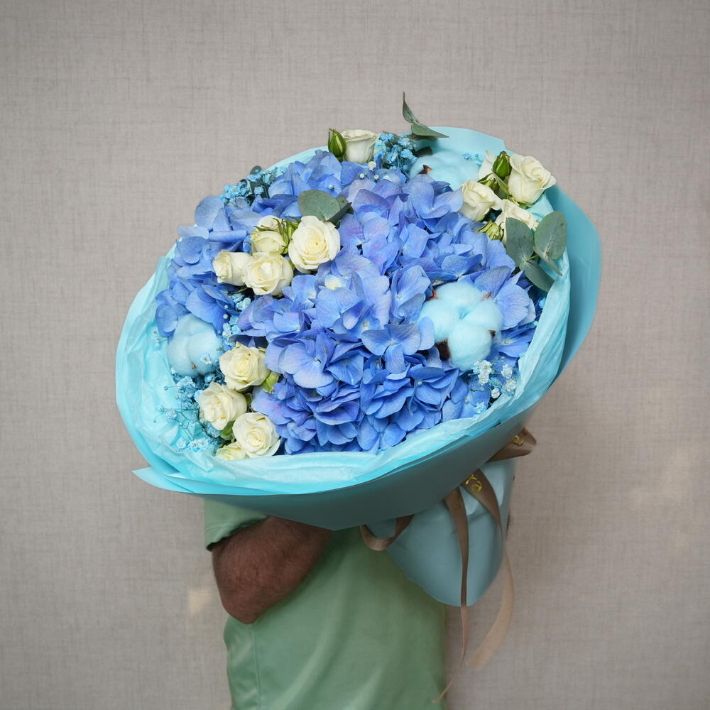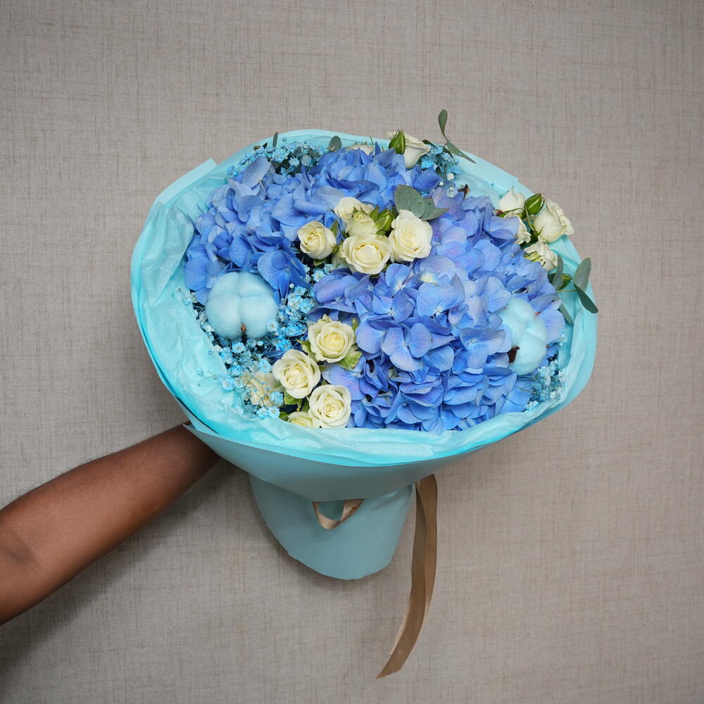 Ribbon - 1 pcs Eucalyptus - 3 pcs Gypsophila - 2 pcs blue hydrangea - 2 pcs wrapping paper - 4 pcs blue cotton - 3 pcs white spray roses (stems) - 3 pcs