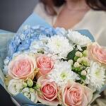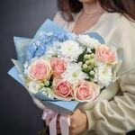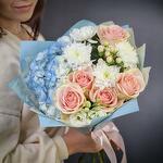 Eustoma - 1 pcs Hydrangea - 1 pcs Wrapping - 1 pcs hypericum - 1 pcs bush chrysanthemum - 1 pcs rose ecuador frutteto - 5 pcs
