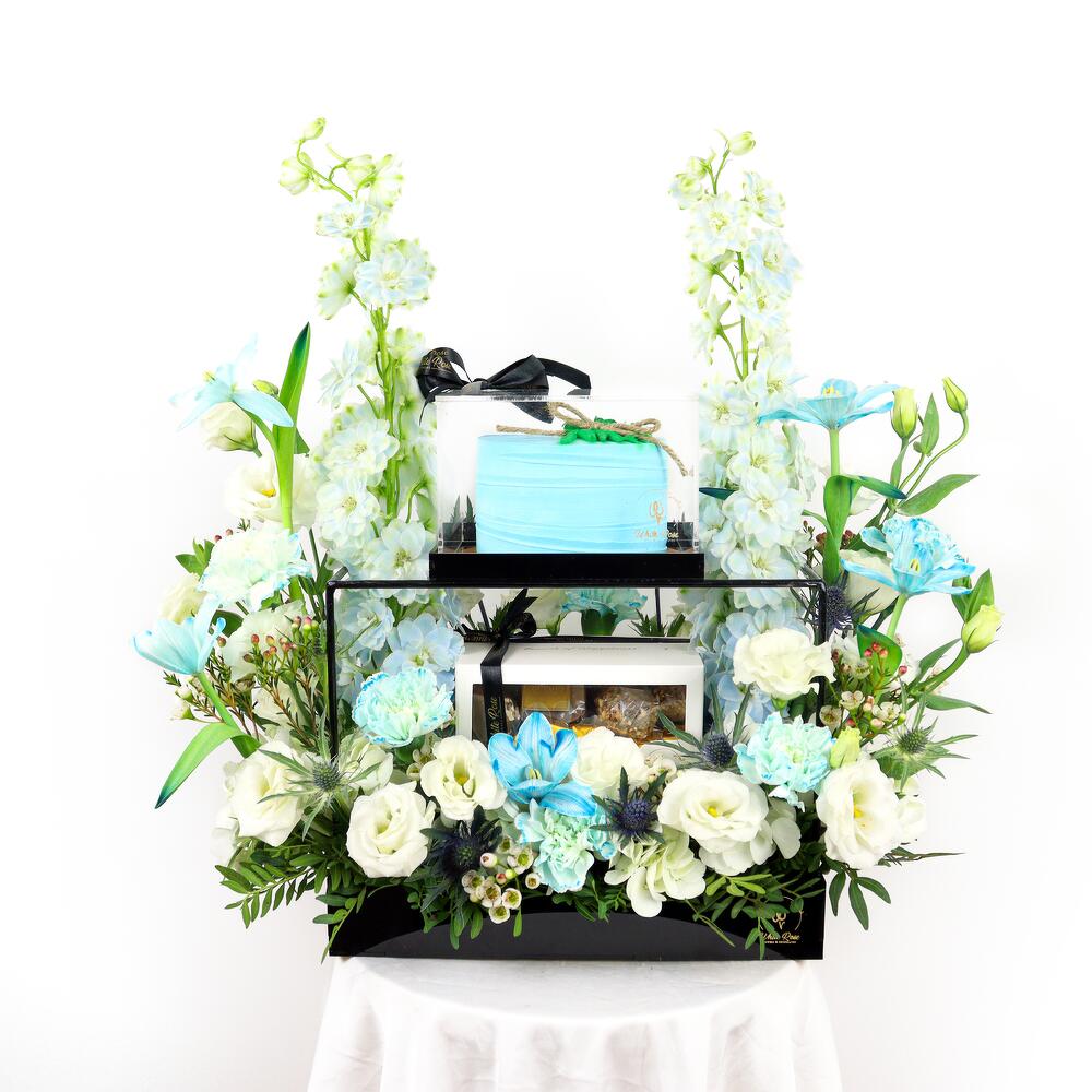 Combination of Delphinium, Tulips, Lisianthus, carnations and other mix of flowers with 300g chocolate and 300g cake in an acrylic stand
