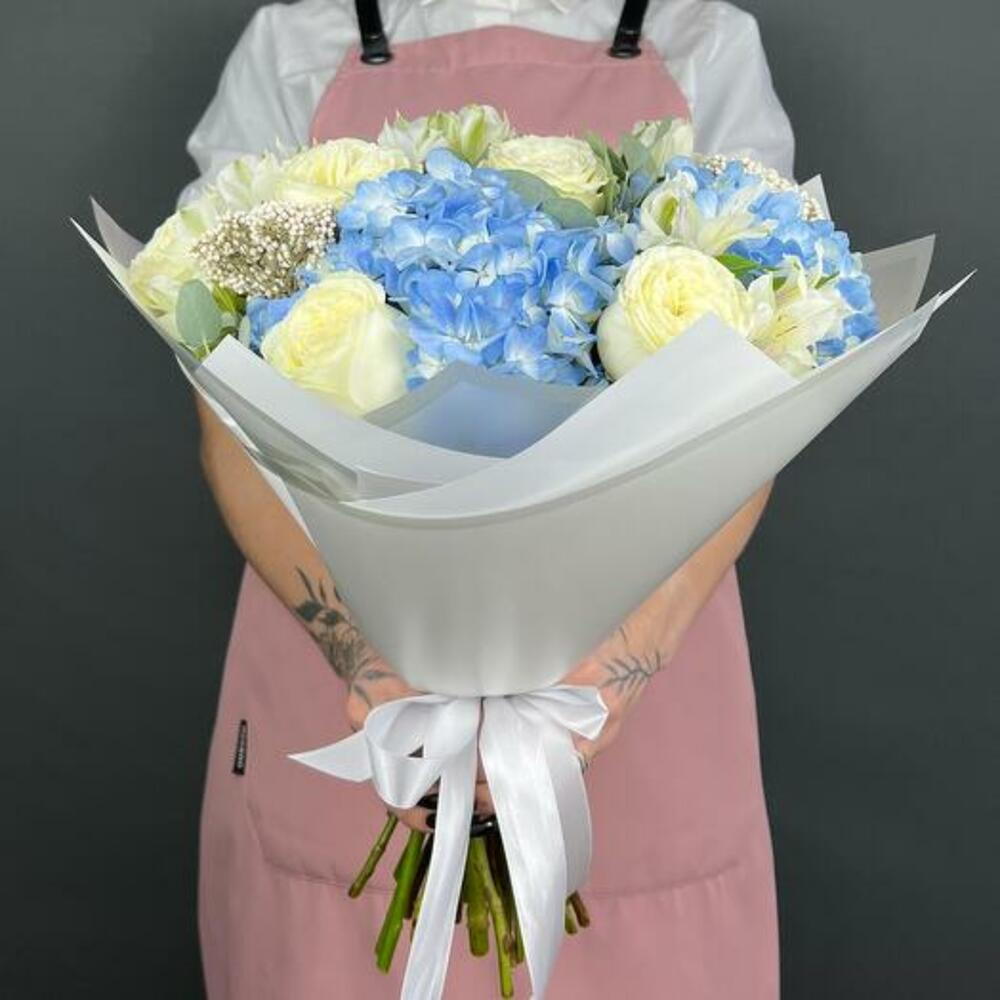 Satin ribbon - 1 pcs Eucalyptus - 5 pcs Hydrangea - 3 pcs Alstroemeria - 5 pcs design packaging - 6 pcs single-headed peony rose - 9 pcs dry ozothamnus - 3 pcs