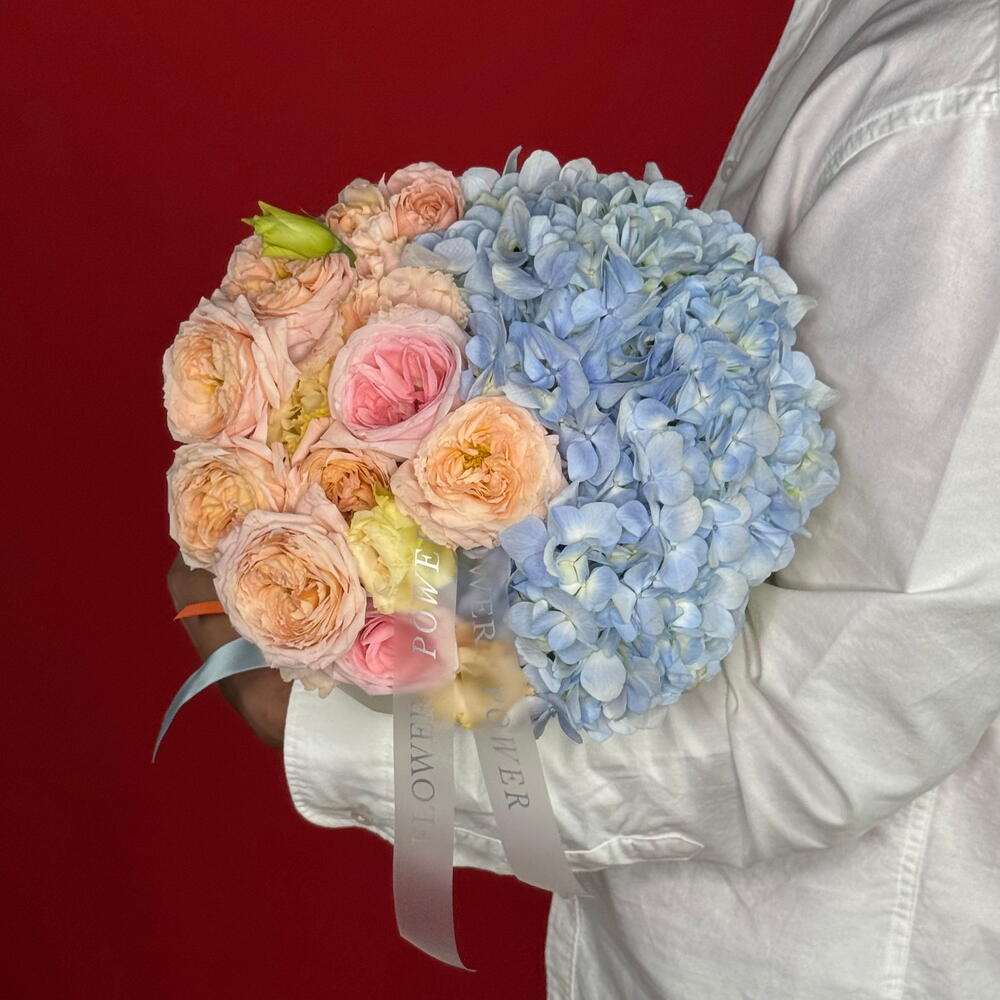 A dreamy and delicate small bouquet featuring light blue hydrangeas, roses, spray roses, and eustomas. This unique blue-tinted arrangement offers a subtle touch of elegance and serenity—a perfect just because gift or a charming surprise for a birthday or new baby celebration.